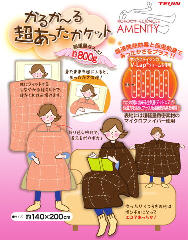 テイジン 新あったかすっぽりケット かるか〜る あったかすっぽりケットが更にパワーアップ! テイジンのV‐Lapウォームを使用し、吸湿発熱効果と保温効果であったかさをプラス!ゆったりくつろぎの時はポンチョになってエコであったか!そのまま暖かブランケットとして、軽くてコンパクトに畳めるからアウトドアにも。