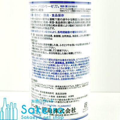 内容量/1L 表示成分/発酵アルコール70.13W/W%(77V/V%)、緑茶抽出物0.01W/W%、乳酸ナトリウム0.01W/W%、グリセリン脂肪酸エステル0.01W/W%、ショ糖脂肪酸エステル0.01W/W%、精製水(純水)29.83W/W%