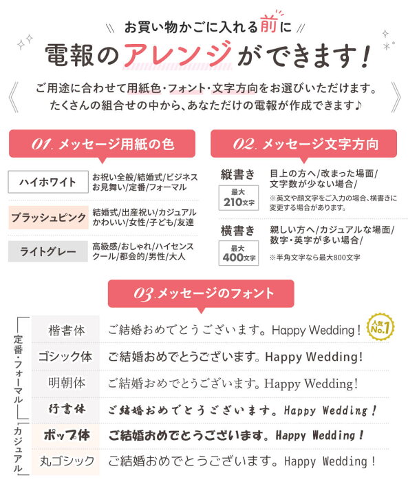 カード名 表紙 中面(中枠付) 121 よろこび ローケツ織 レザック66(橙) 122 祝賀 ヨーロピアンシルキー レザック66(ミルク) 123 至福 ナチュラルモアレ 水色(木目模様は変化します) タント(P-68) 124 称賛 桜 メルヘン レザック(黒)、つづれ(紅) 127 希望 桜 ファンシーテックス タント O-52 (薄いピーチ) 128 祝福 シャンタンV SV タント N-8 (白) 別タイプの電報で送る 漆芸電報(4,950円) 布張りカード(2,860円) プレミアムカード(2,200円) 紙素材カード(1,540円) 電報なし >ぬいぐるみ電報